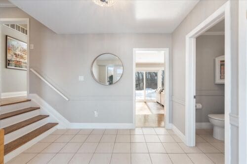 As you step into the large foyer, you’ll immediately notice the spacious hall closet and convenient powder room. The inviting and captivating family room features a wall of windows, showcasing the peaceful backyard setting. Generously sized, this room is perfect for family movie nights or watching the big game. Adjacent to the family room is a conveniently located 4th bedroom, complete with a Murphy bed for versatility.