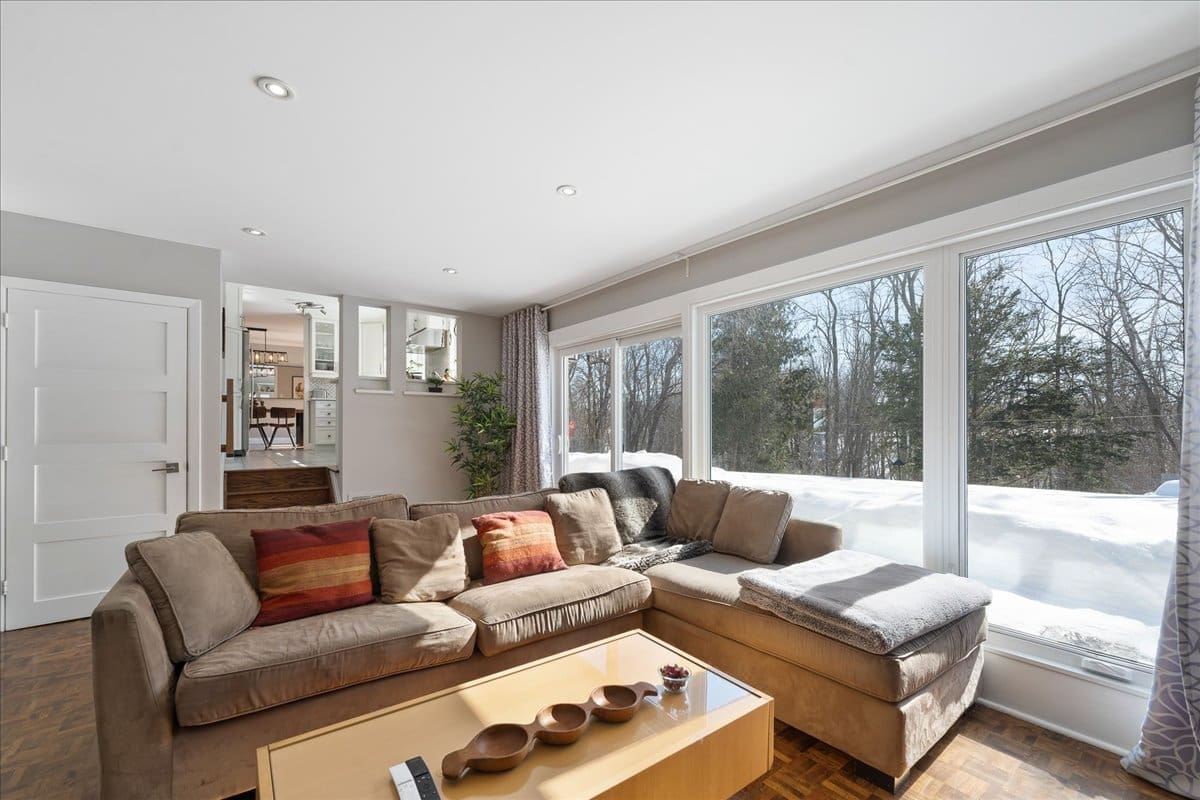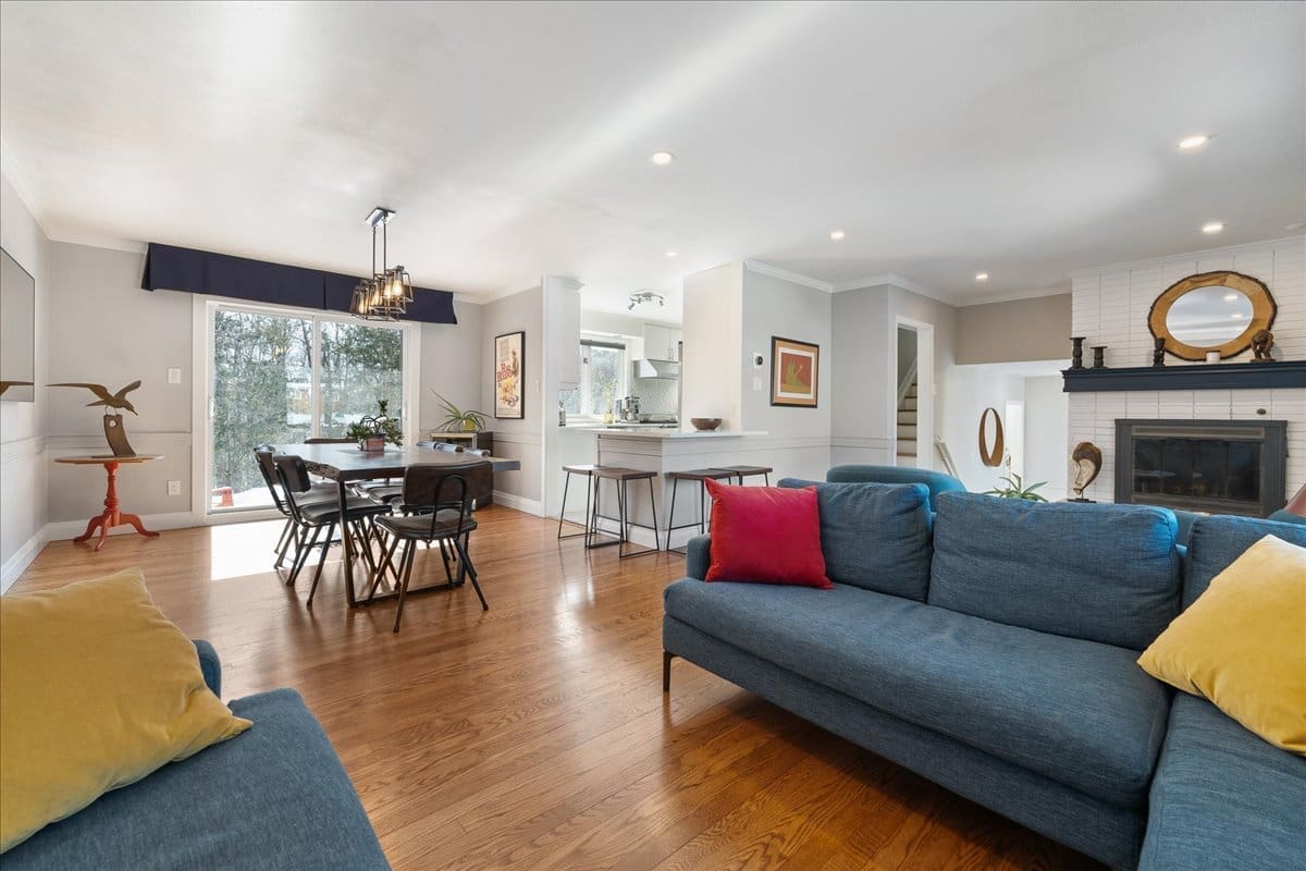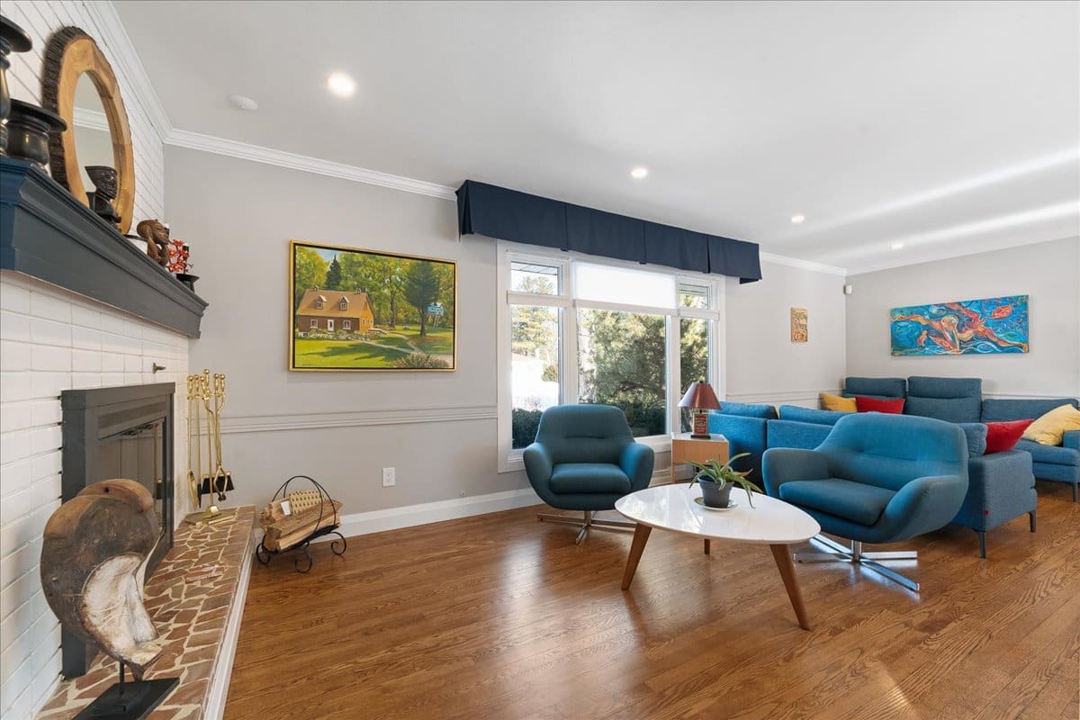 - Spacious Living Areas: Multiple gathering spaces, including a family room with a wall of windows, a large dining room, and a living room with a cozy wood-burning fireplace.