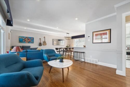 The fully renovated kitchen is a true showstopper with features straight out of a magazine. With crisp cabinetry, gleaming white quartz countertops, a dazzling backsplash, and high-end stainless steel appliances—including a Wolf range – it is a dream for any chef. The expansive dining room provides ample space to host large gatherings, while the spacious living room is designed for ultimate comfort, offering two distinct areas: one to relax by the wood-burning fireplace and another perfect for lively conversations.