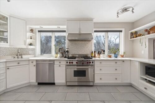 - Chef’s Dream Kitchen: Fully renovated with sleek white quartz countertops, high-end stainless steel appliances, a Wolf range, and elegant cabinetry.