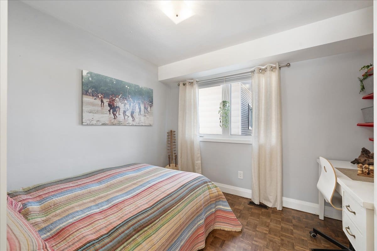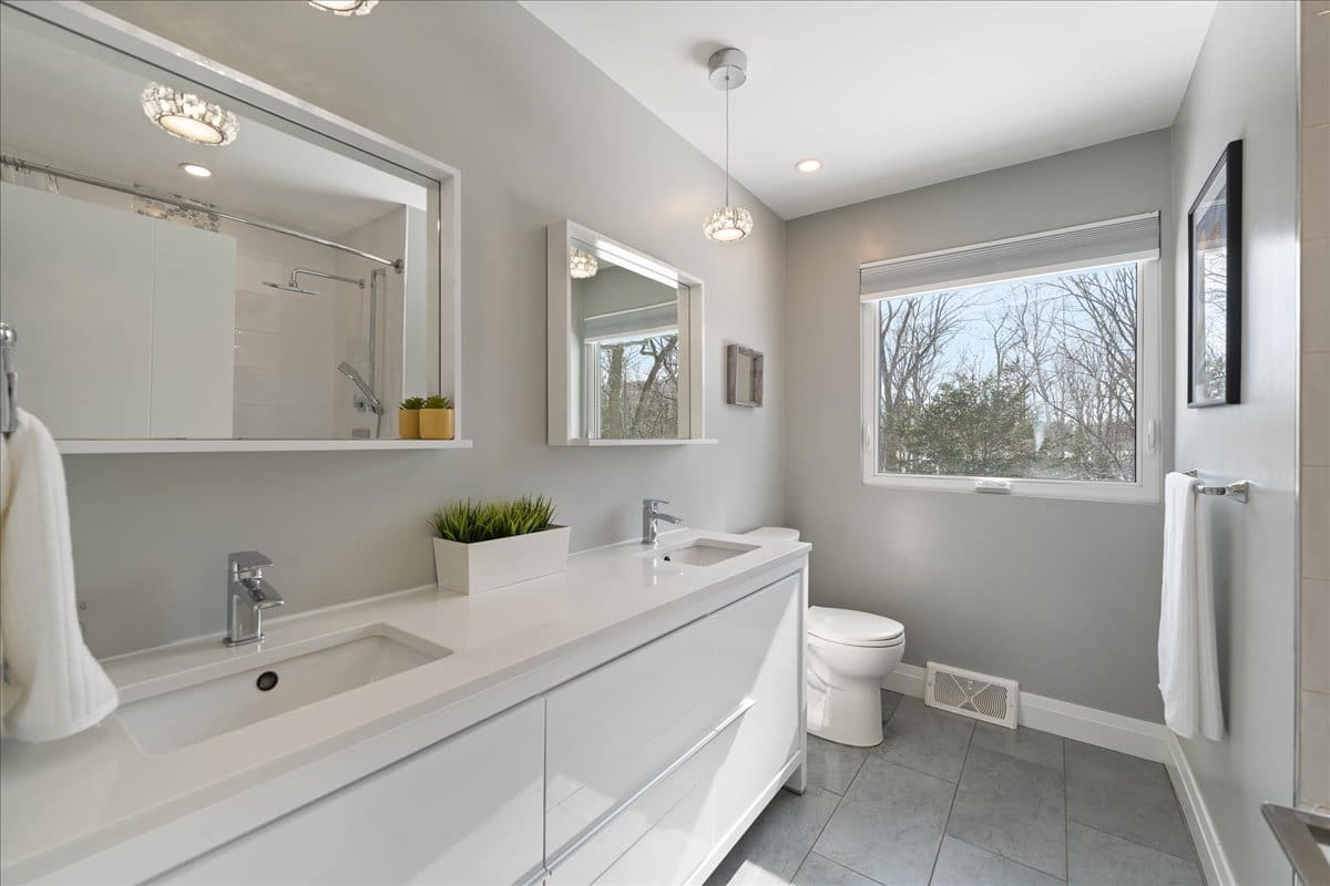 Upstairs, the primary bedroom is a serene retreat, featuring a full wall of closet space and a large window that offers a beautiful view of the quiet street. The secondary bedrooms are generously sized, with plenty of closet space. The fully renovated bathroom is an absolute stunner, boasting a dual vanity and a tub/ shower with intricate tile accents and dual shower heads; all bathed in modern white tones.