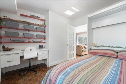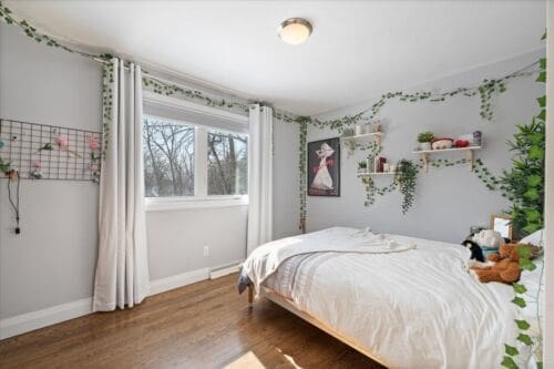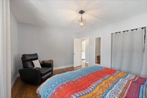 - Primary Suite Retreat: Expansive primary bedroom featuring a full wall of closets and peaceful views of the quiet street.